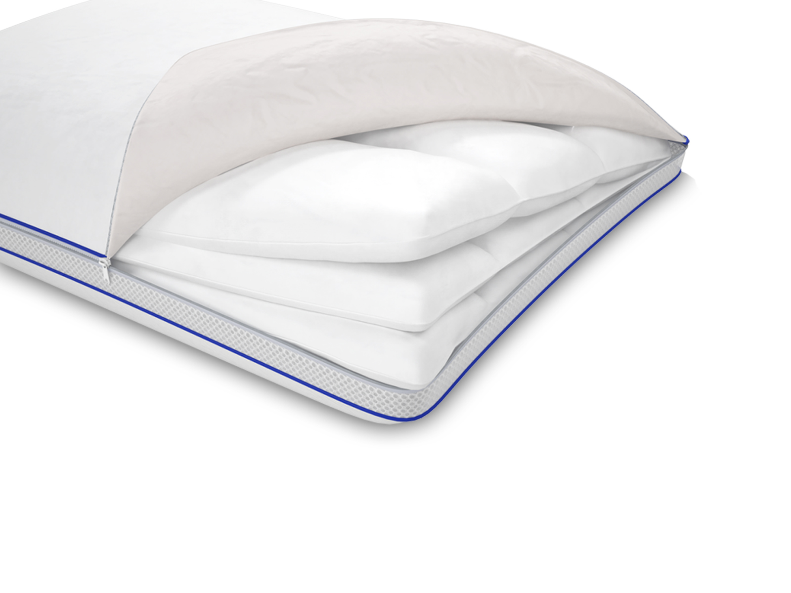 Внешний чехол обеспечивает сохранность изделия, а также воздухопроницаемость, и выполнен из пуходержащего ТИКа (100% хлопок) и 3D сети из 100% полиэстра.
